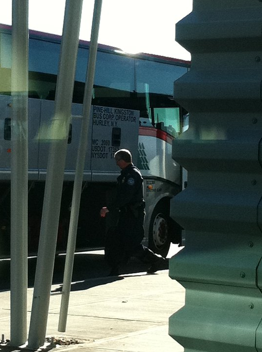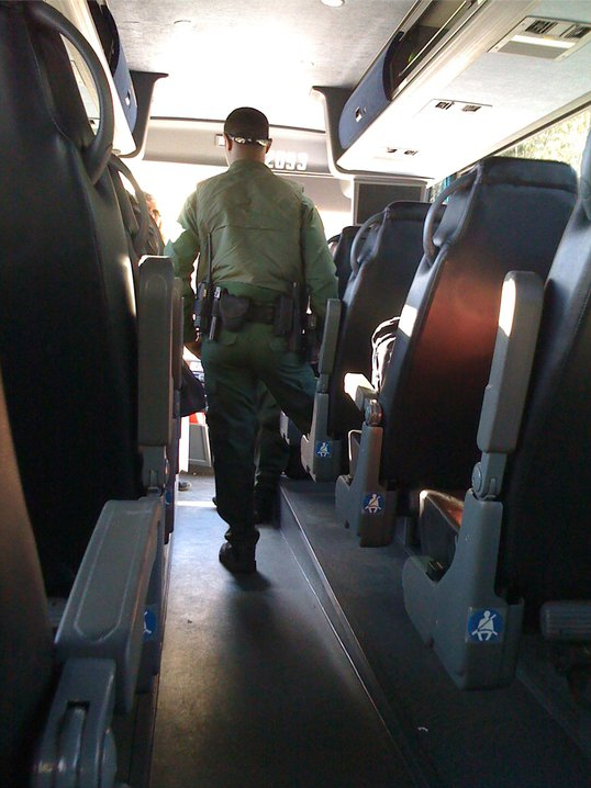 (Vous pensiez que c’était fini ? Non non.) 30 minutes plus tard alors qu’on se dit qu’on est tranquille jusqu’à New York, HOP, un petit ralentissement et voilà que le bus se range sur le côté. On pense d’abord à un arrêt « normal » sur une aire de repos. Les portes s’ouvrent, 2 mecs de la douanes volantes montent à bord et à :